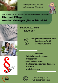 kostenfreier Vortrag von Christa Kröger von der Pflegeberatung des Kreises Paderborn; Anmeldung: leo@awo-paderborn.de oder 05251/2906615